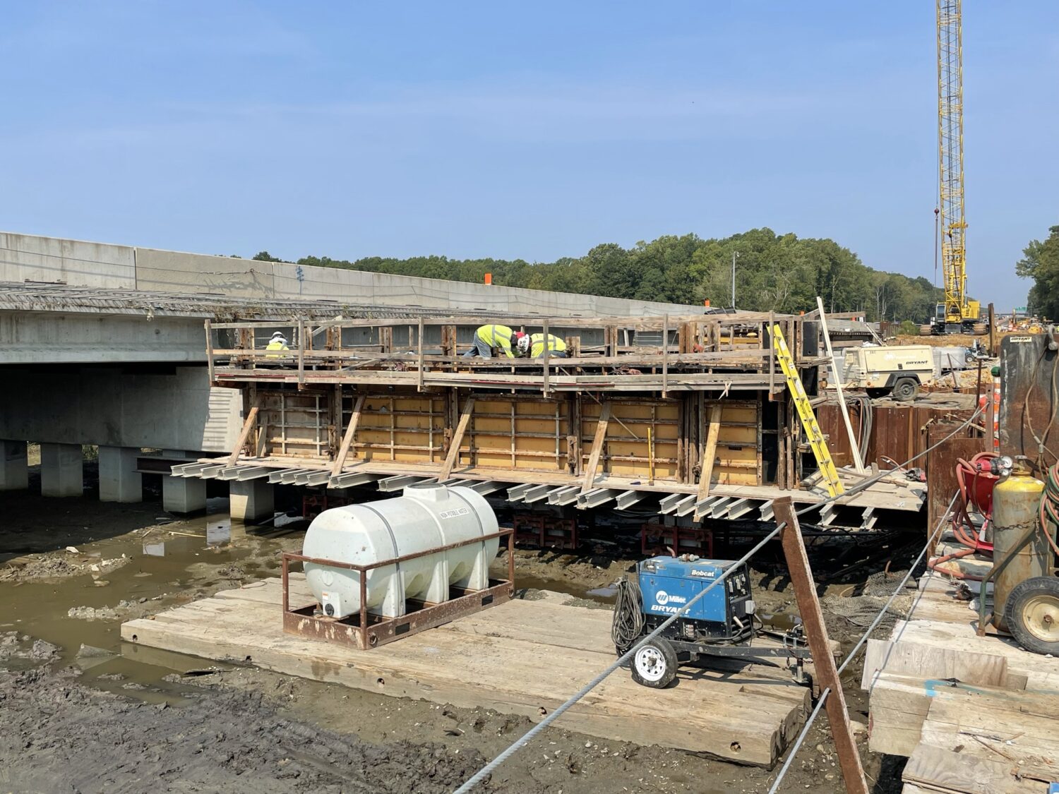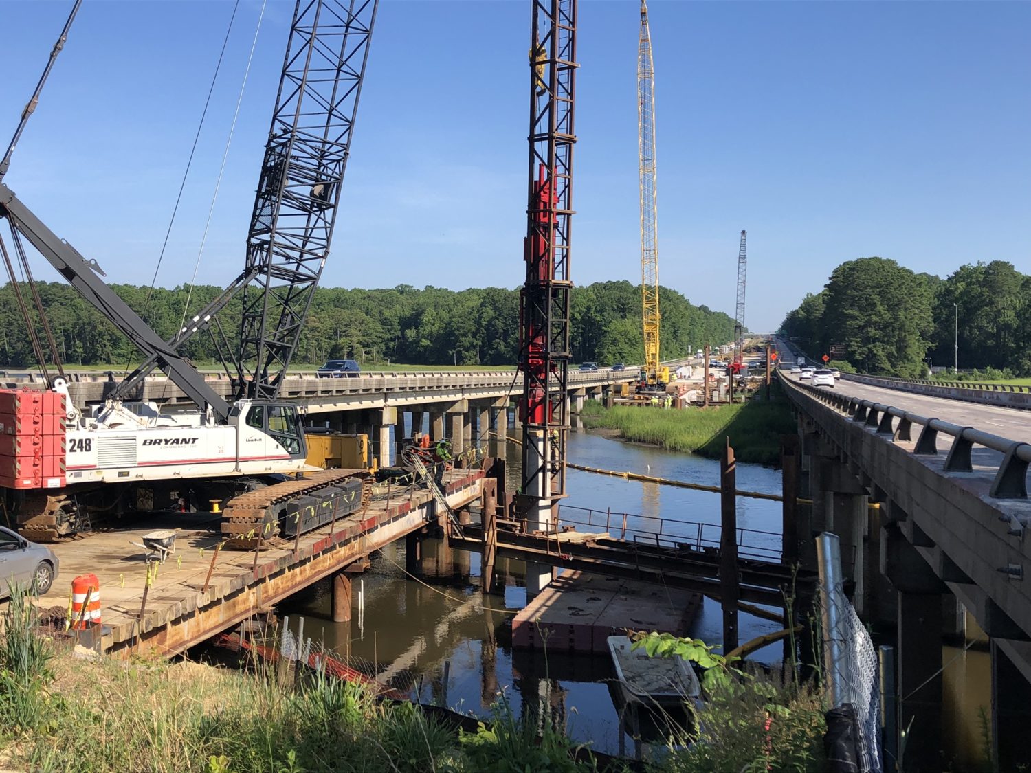 As part of the I-64 Capacity Improvements-Segment III project, Bryant Contracting, Inc. was awarded a $24 million subcontract to demolish and replace the existing bridges on I-64 over Queens Creek with two new bridges over 800′ in length. The project required work from a temporary trestle to construct the spans over Queens Creek and environmentally sensitive wetlands. Construction of the Queens Creek bridges started in March of 2019 and was completed in November 2021.